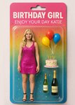Featuring a female figurine with a face swap photo upload, wearing a pink glitter dress in a clear package with balloons, a birthday cake, and wine bottles on a multicolour gradient background.