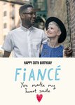 Front of card: Fiancé's 30th Photo Upload Birthday Card Black and blue typography on a white background. Text reads: "Happy 30th birthday fiancé you make my heart smile.". 'Happy 30th birthday' can be personalised!