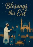 A warm, traditional design featuring a night time illustration of a Muslim family in front of a mosque, on a dark blue background.