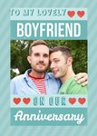 Front of card: Card Features a large photo upload in the Middle with typographic text and Illustrated Love Hearts Text reads: To My Lovely Boyfriend On Our Anniversary!