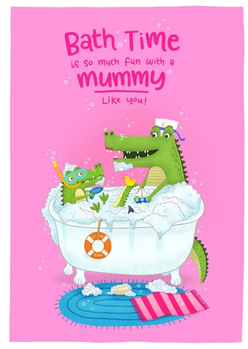 Illustration of Mummy and baby crocodile in a bubble bath with text above on a pink background.
