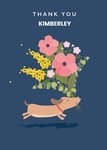 Illustration of sausage dog running with bouquet of flowers a blue background.