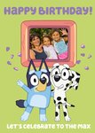 Front of card: Features an illustration of Bluey and Chloe with a editable photo upload above this. Text reads: "Happy Birthday! Let's Celebrate to The Max."