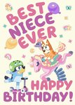 A bright and cheerful birthday card featuring characters from the popular show Bluey, Bluey is riding a scooter and Bingo is riding a pink unicorn, surrounded by colourful balloons & confetti shapes. Bold pink and purple typography sits at the top and bottom of the card.