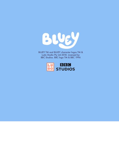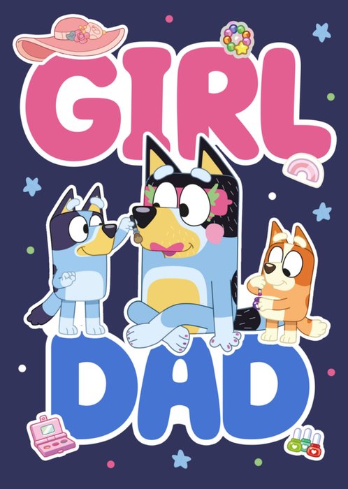 A sweet and funny Father’s Day card featuring Bluey and Bingo giving their dad a makeover. The characters are surrounded by colourful stars, nail polish, rainbows and dress-up stickers, with the bold caption “Girl Dad” in pink and blue. A great choice for a loving dad who’s happy to play along with his daughters' games.