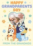Front of card: Featuring an illustration of Bluey and Bingo with a heart shaped photo frame surrounded by colourful flowers. Text reads: "Happy Grandparents Day from the grandkids". 'From the grandkids' can be personalised!