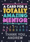 Front of card: Amazing Mentor Thank You Card Bold and colourful typography on a black background. Text reads: "A card for a totally amazing mentor thank you Andrew". 'Thank you Andrew' can be personalised!