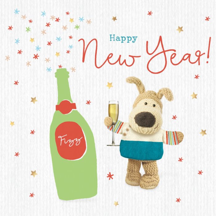 Featuring Boofle holding a champagne flute beside a large bottle of fizz, with scattered star confetti on a white striped background.