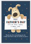 Featuring a Boofle character holding a large, oversized stamped letter. The letters in 'Father's Day' have multi-coloured abstract patterns in each letter. There are little colourful triangles in the background.