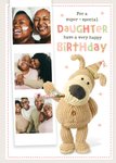 Front of card: Boofle Photo Upload Daughter's Birthday Card Featuring Boofle with a photo strip. Text reads: "For a super-special daughter have a very happy birthday".