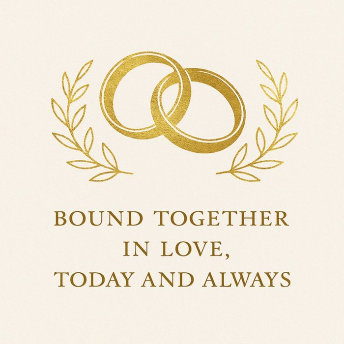 Featuring two interlocking gold wedding rings with leafy branches on a cream coloured background.