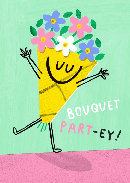 Front of card: Featuring a fun illustration of a smiling bouquet of flowers with a brush-style message underneath, on a green & pink speckled background.