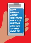 This greeting card design features a red background with an illustrated hand holding a smartphone. The phone screen shows a blue text message bubble that reads, “Happy Birthday Auntie! This could’ve been a text, I hope you appreciate the effort I went to!” in a playful white font.