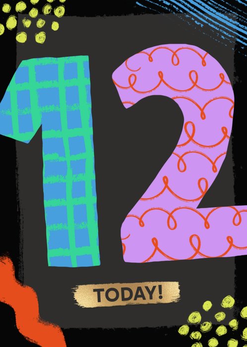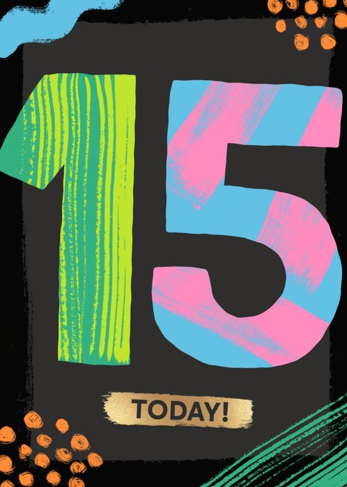 A bright, vibrant design featuring a large '14' filled with colourful brush lines surrounded by hand-painted spots, lines and doodles. Underneath is a gold block with black text. The design sits on a two-toned black background.
