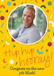 Front of card: Colourful confetti on bright yellow background with photo upload in center and text underneath Text reads: "Hip Hip Hooray! Congrats on the new job Mark!" With customisable name and photo.