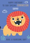 Front of card: Bright fun illustration of a cute lion on a blue background Text reads: "Happy Birthday To Our Special Grandson Geoffrey Have A Roarsome Day" With customisable name.