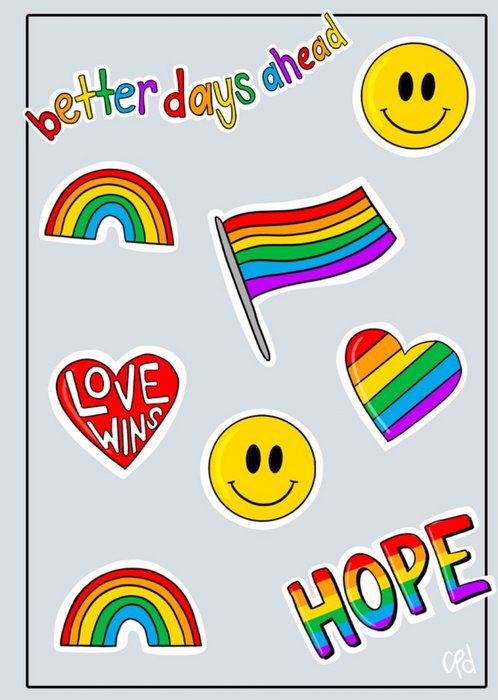 Bright graphic design featuring different icons including a smiley face, a rainbow loveheart, a rainbow flag, a rainbow, a red loveheart with the words Love Wins on it and the word Hope with a rainbow pattern on it.. The non editable caption reads better days ahead. The card background colour is grey.