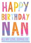 Bright Patterned Letters Happy Birthday Nan Postcard