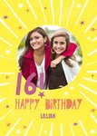 Large photo upload circle in centre on a bright yellow background. White lines radiate out with small colourful stars. Birthday message below in funky purple and orange text with editable name.
