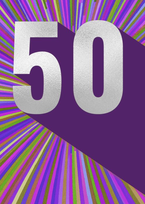 Featuring a large silver metallic number 50 with a long purple drop shadow, on a vibrant, starburst of multicoloured stripes.