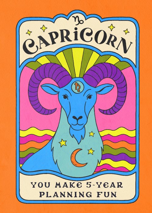 Featuring a bold illustrated blue goat with large purple curved horns, astrological symbols and stars, set above wavy multicoloured stripes and framed in a tarot-style border with “Capricorn” text at the top and a playful message panel at the bottom, on an orange background.