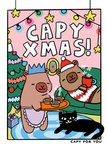 Featuring an illustration of two capybaras and a black cat in a cosy Christmas scene.