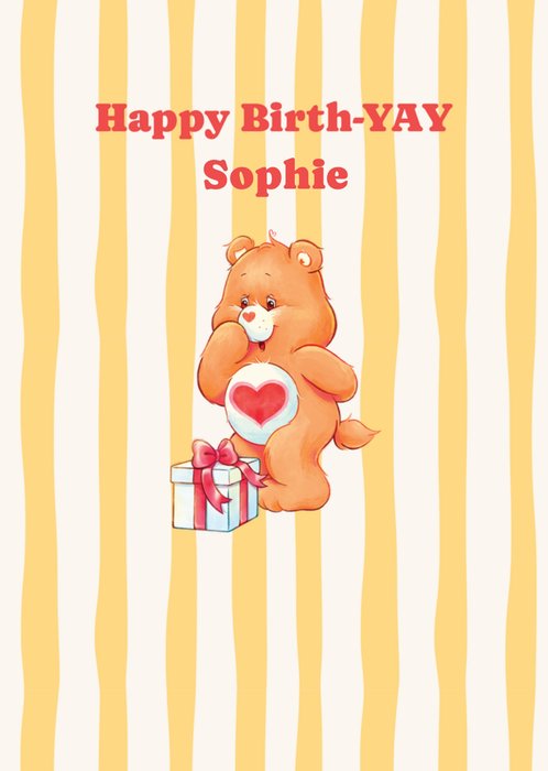 A cheerful birthday card featuring an orange Care Bear with a heart on its belly, standing next to a wrapped gift against a yellow and cream striped background, personalised with the name "Sophie".
