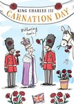 Front of card: Carnation Day Card Illustration of King Charles and the royal guards. Text reads: "King Charles III Carnation Day!" and "blithering fools!".