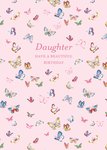 This greeting card design features a light pink background adorned with a scattered pattern of colourful butterflies in various sizes, accompanied by the text “Daughter Have A Beautiful Birthday” in elegant pink lettering centred towards the top.