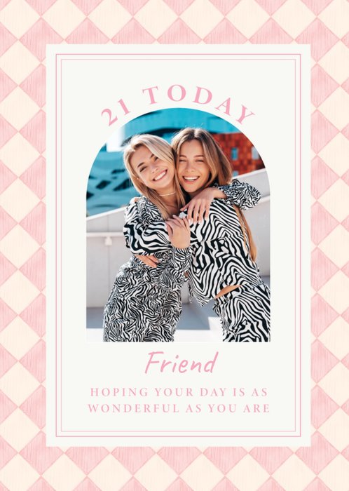 Featuring 1 arched photo upload area with text above & below surrounded by a double-lined border on a white background & a pink & cream argyle pattern.