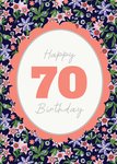 This classic Cath Kidston design features an orange scalloped oval with hand-lettered text and an editable number, surrounded by a colourful floral pattern with a black background.