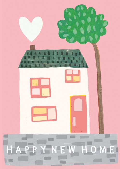 This greeting card design features an illustrated townhouse with detailed windows, floral decorations, and a red front door, conveying a warm and cheerful atmosphere. The text on the card reads, “Lovely New Home.”