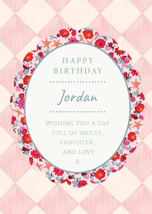 This elegant Cath Kidston design features an oval text frame with a scalloped floral edge on a pink and cream checkered background.