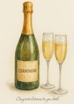 Featuring a watercolour illustration of a champagne bottle beside two filled flutes on a cream background with script text at the bottom of the card.
