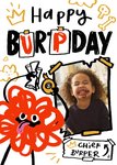 Chaotika bright and fun illustration featuring a scribble monster and various icons including a skull, bones, clouds and a crown. There is also a photo upload option. The typographic, non editable caption reads Happy Burpday, Chief Burper. The card background colour is white.