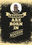 Front of card: Rustic, typography on distressed background with round photo upload at top of page. Text reads: "LEGENDS ARE BORN IN AUGUST" With editable photo