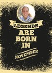 Front of card: Rustic, typography on distressed background with round photo upload at top of page. Text reads: "LEGENDS ARE BORN IN