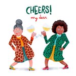 Featuring an illustration of two old ladies in outlandish outfits enjoying a glass of wine.