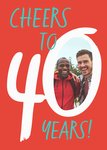 Front of card: This greeting card design features the text “Cheers to 40 Years!” in bold turquoise and white lettering on a bright red background. The number “40” is large and eye-catching, with playful brush-stroke typography that adds energy and celebration to the milestone birthday theme. There is a photo upload area inside the number zero.