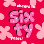 Featuring the phrase “cheers to sixty years!” in playful bubble-style lettering. The word “sixty” is written in large pink letters decorated with white doodles and hearts, set against a bold red background with abstract pink flower shapes.