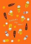 Front of card: Featuring smiling bottles, beer mugs, and cans on a bold orange background with scattered stars & white hand-lettered typography in the centre.