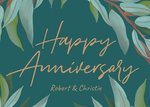 Front of card: Happy Anniversary Card Features illustrations of leaves on a green background surrounding gold text in the center of the card. Text reads: "Happy Anniversary". with maller text underneath that reads: "Robert & Christie" Recipients are editabe.