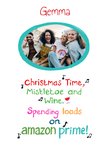Front of card: Featuring vibrant typography with a circular photo frame on a white background. Text reads: "Gemma Christmas time, mistletoe and wine. Spending loads on Amazon Prime". 'Gemma' can be personalised!