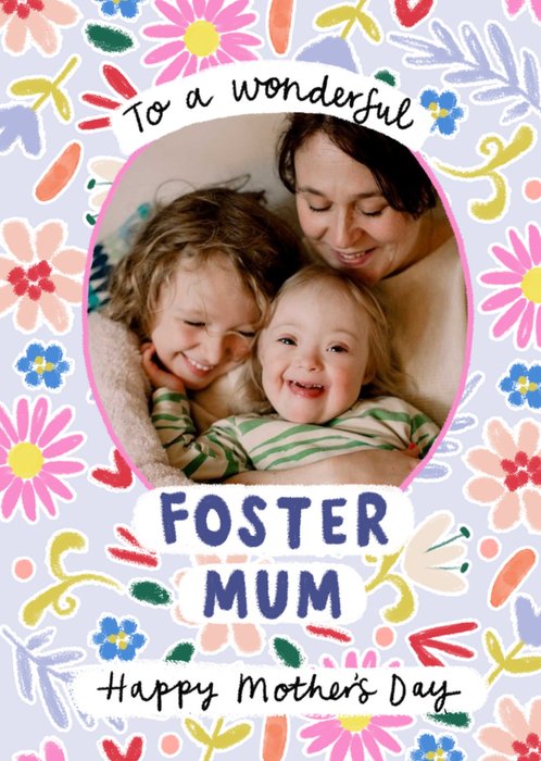 Front of card: Foster Mum Photo Upload Mother's Day Card Circular photo frame surrounded by colourful flowers. Text reads: "To a wonderful foster mum happy mother's day".