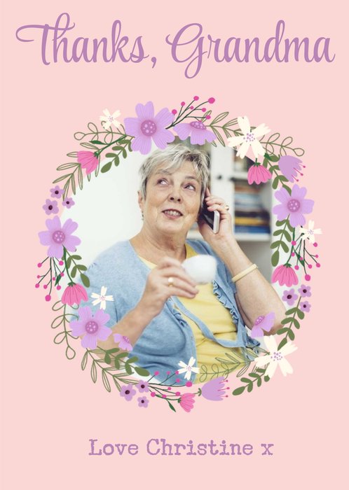 Front of card: Thank You Photo Upload Card Circular photo frame with a flowery border on a pink background. Text reads: "Thanks, Grandma love Christine x". All text can be personalised!