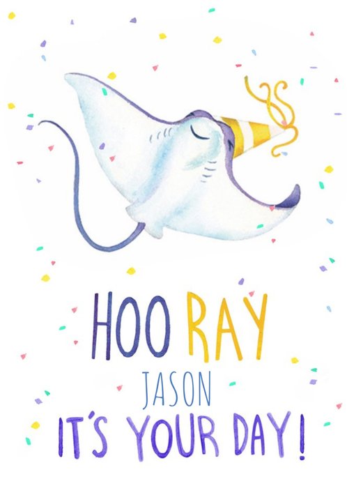 Front of card: Illustration of a Stingray with a party hat on, with confetti and colourful text. Text reads:"HooRay Jason, it's your day!". With editable name