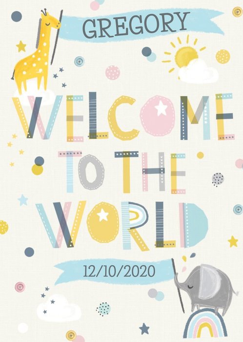 Clintons Colourful Illustrated Animals Customisable Welcome to the World Card