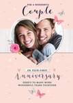 Front of card: Heart Shaped Photo Upload with text Text reads: "For Wonderful Couple On Your First Anniversary Here's To Many More Wonderful Years Together"