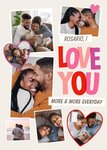 Front of card: Love You Photo Upload Valentine's Day Card Collage of various sized photo frames. Text reads: "Rosario, I love you more & more everyday". 'Rosario, I' can be personalised!
