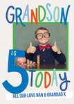 Front of card: 'Grandson is 5 today' Photo Upload Birthday Card Colourful and fun typography with a photo frame on a white background. Text reads: "Grandson is 5 today" and "all our love Nan & Grandad x". 'All our love Nan & Grandad x' can be personalised!